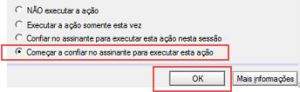 O pop up “Alerta de segurança de execução” pode aparecer uma ou mais vezes durante o uso do Sistema FSM. Sempre que ele aparecer o procedimento deve ser o mesmo, selecione a última opção “Começar a confiar no assinante para executar esta ação” e depois em “OK”.